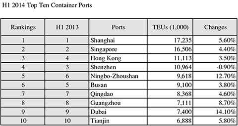 A ranking list of the world’s 10 leading container ports was recently made according to throughput in the first half (January-June) of this year. The two most busiest ports remained unchanged from a year earlier, while Hong Kong, which ranked fourth in the first half of 2013, came back to finish in fourth place.