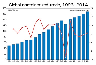Global containerized trade grew by 4.6 percent in 2013 taking total volumes to 160 million TEUs, up 4.6 percent from 153 million TEUs in 2012. Together, intraregional (led by intra-Asian trade) and South–South trades accounted for 39.8 percent of global containerized trade shipments in 2013, followed in descending order by North–South trade (17.0 percent), the transpacific (13.6 percent), Far East–Europe (13.1 percent), secondary East–West (12.6 percent) and transatlantic (3.9 percent).