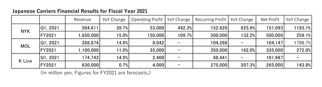 For fiscal 2021, NYK has made an upward revision of its original profit projection. Now, it anticipates a consolidated net profit of ¥500 billion, up 259.1% from fiscal 2020. Having taken a similar step, MOL expects its group will make a net profit of ¥335 billion, which is greater by 272%. ''K'' Line has also followed suit. A consolidated net profit of ¥265 billion is envisaged now, an increase of 143.8%.