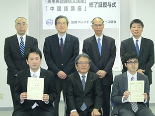 日本インターナショナルフレイトフォワーダーズ協会(JIFFA)は15日、12年10月ー13年3月にかけて開催した「実用英語通信文講座」と「初級中国語講座」の修了証書授与式を東京・茅場町のJIFFA事務局で開催、中村次郎会長(日本通運副社長)が英語と中国語講座それぞれ1名の成績優秀者に修了証を手渡した。