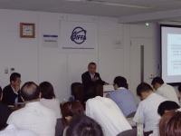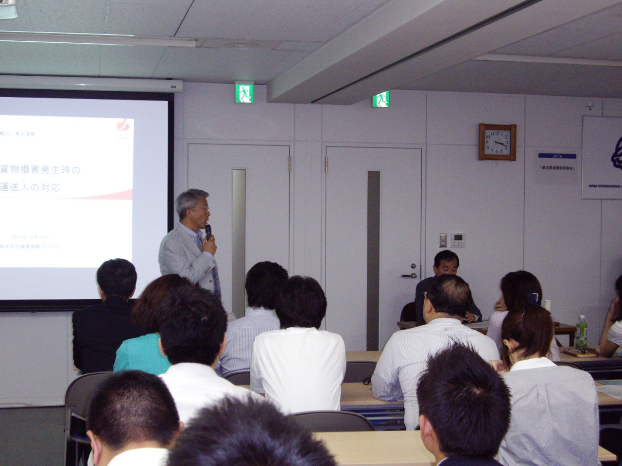 二つ目のテーマとして、「輸入貨物損害発生時の運送人の対応」を取り上げ、基礎知識編とケーススタディの二部構成で、JIFFA賛助会員の株式会社損害保険ジャパン海上保険金サービス室グローバル物流第二グループから講師を招いて開催した。このテーマを取り上げた理由について、7月に小倉でJIFFA教育委員会が主催した「国際複合輸送業務集中講座」にて、運送人が常日頃から行うべき輸入業務を中心としとしたリスク管理を採り上げた、非常に評判が良く、関東地区にても開催して欲しとの会員の要望を受け、今回の研修会のテーマの一つとして採用したこと、最近では、コンテナ船がインド洋で沈没するという事故が発生していることをJIFFA教育委員会中込委員長より説明がされた。前半では、リーダーの篠原氏より、請求権者、損害賠償責任の負担者、運送人の責任範囲、外航貨物保険、及びJIFFA賠償責任保険に関する解説がされ、後半では同グループリーダーでJIFFA法務委員の佐子氏より、荷主や実運送人との交渉例をはじめ、タイムバー延長の重要性など、六つの事例をもとに対応策の解説がされた。