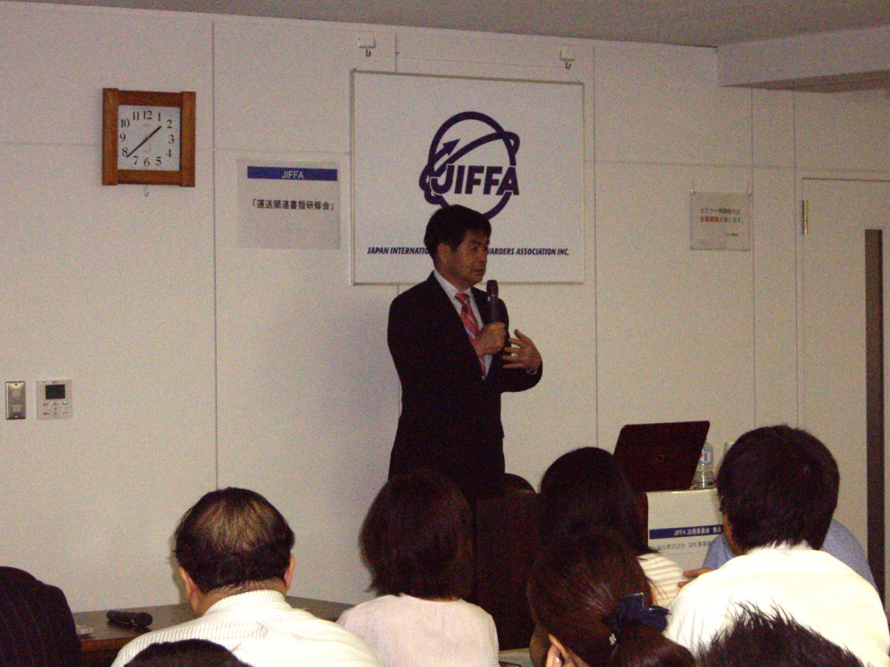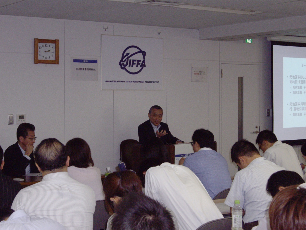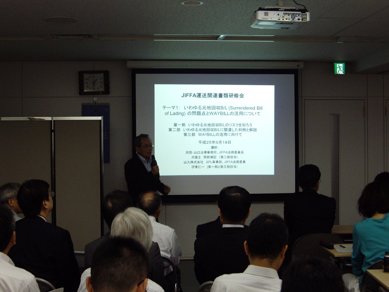 研修会では、JIFFA法務委員会坂東副委員長により、テーマとして取り上げた理由についての説明に続き、元地回収B/LのリスクとWAYBILLの活用については伊東仁一JIFFA法務委員(山九3PL事業部)が、元地回収B/Lに関連した判例と解説は岡部博記JIFFA法務委員長(岡部・山口法律事務所)が解説した。