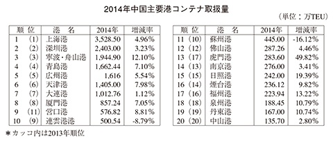 中国港湾協会(CPA)はこのほど2014年のコンテナ取扱量上位20港のランキングをまとめた。8位までの順位は前年と変わらなかったが、9位は営口港が前年の11位から2ランクアップした一方で、連雲港港が前年の9位から10位に後退した。上位10港が500万TEUを突破し、1,000万TEU超えは前年同様7港だった。2,000万TEU以上は上海港と深せん港の2港だけだったが寧波・舟山港も1944.9万TEUとあと一歩のところまで上昇した。