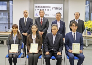 写真は前列の伊藤会長(中央)をはさんで英語成績優良者の村松厚子さん(ネットインターナショナル、左から2番目)と山田万里香さん(新開トランスポートシステムズ、左端)、中国語成績優良者の持田大輔さん(日通商事、右端)。