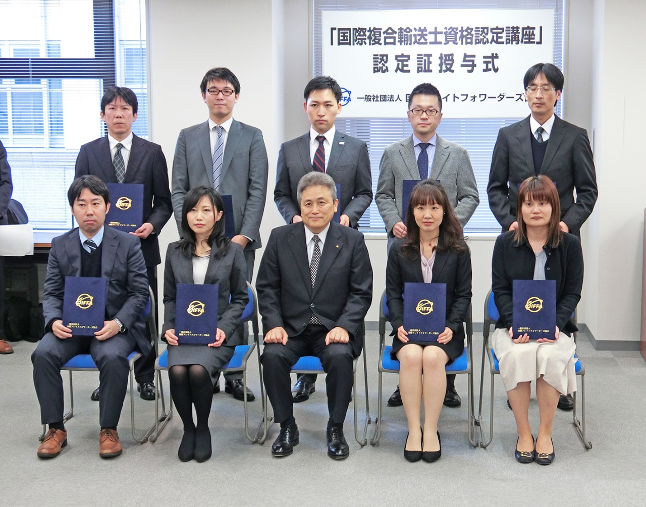 教育委員会は2017年度の事業として東京と大阪で実施した国際複合輸送士資格認定講座の認定試験合格者のうち成績優秀者を事務局に招き、伊藤豊会長(日本通運副社長)が認定証と記念品を手渡して表彰した。