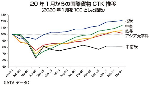 国際航空運送協会(IATA)によると、3月の世界の航空貨物荷動きは重量で過去最高となり、貨物トンキロ(CTK)ベースでは前年同月比22.1%増加、国際貨物も22.6%増と大幅な伸びとなったが、これは前年がCOVID-19の影響で異常なマーケット状況だったためで、パンデミック以前の19年との比較では4.4%増と回復基調が持続している。前月との比較では0.4%の微増にとどまったが、これは2月の実績が19年同月比で9.2%増、前月(21年1月)からは1.8%増と急上昇したことや、3月のアジア太平洋とアフリカの市場がそれぞれ前月比で2.5%、5.9%のマイナスとなったためで、堅調に回復している状況に変わりはない。今年第1四半期ではCTKの伸び率は5.6%で19年の水準を上回り前年同期比では14.1%増と2ケタの伸びとなった。