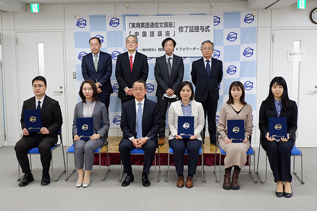 国際フレイトフォワーダーズ協会(JIFFA)は2日、21年度の「初級中国語講座」と「実用英語通信文講座」の成績優良者を事務局に招き、渡邊淳一郎会長が修了証と記念品を授与した。